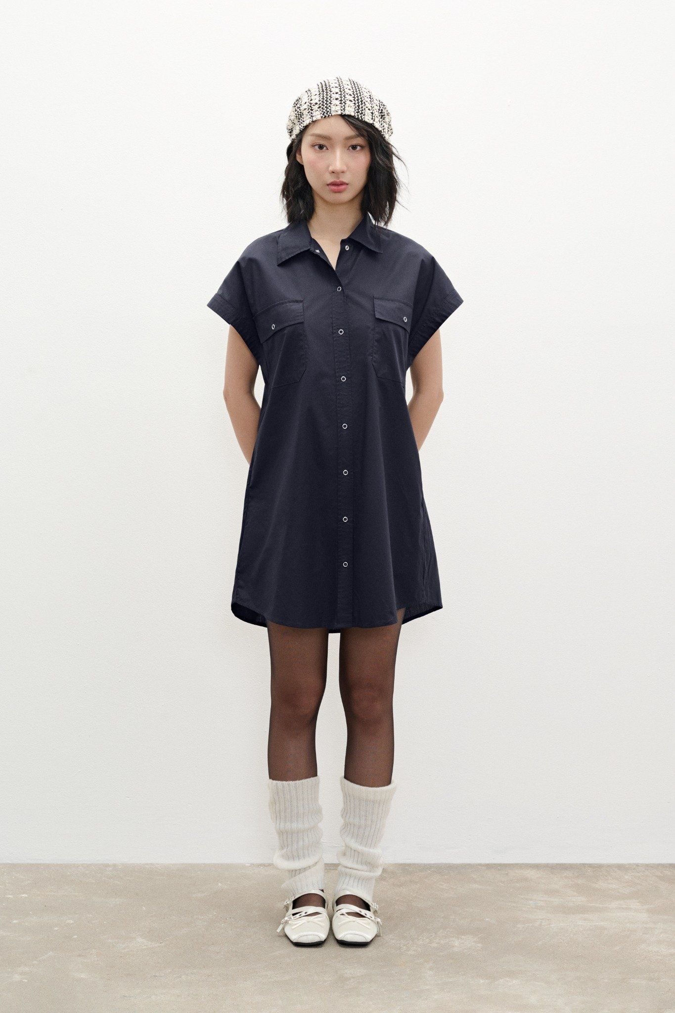 Đầm sơ mi dáng suông ngắn trên gối, tay lửng thả vai, hai túi thân trước và hai túi hai bên. Sản phẩm cài hàng nút thân trước.