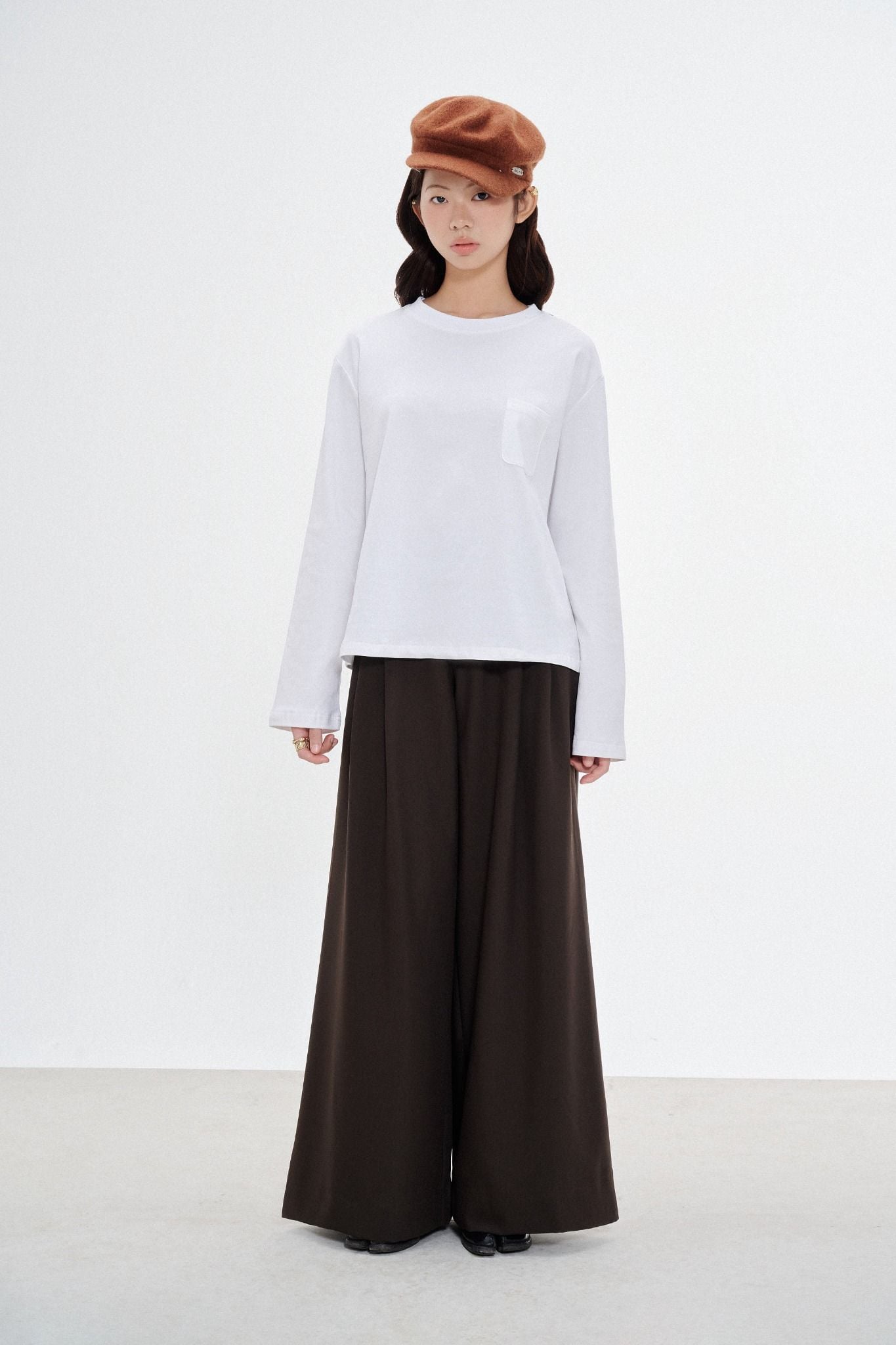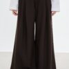 Quần dài ống rộng có xếp ly thân trước, dáng suông, lưng ngang rốn, có hai túi bên sườn và một túi kiểu thân sau. Quần cài khoá kéo và nút cài thân trước.