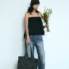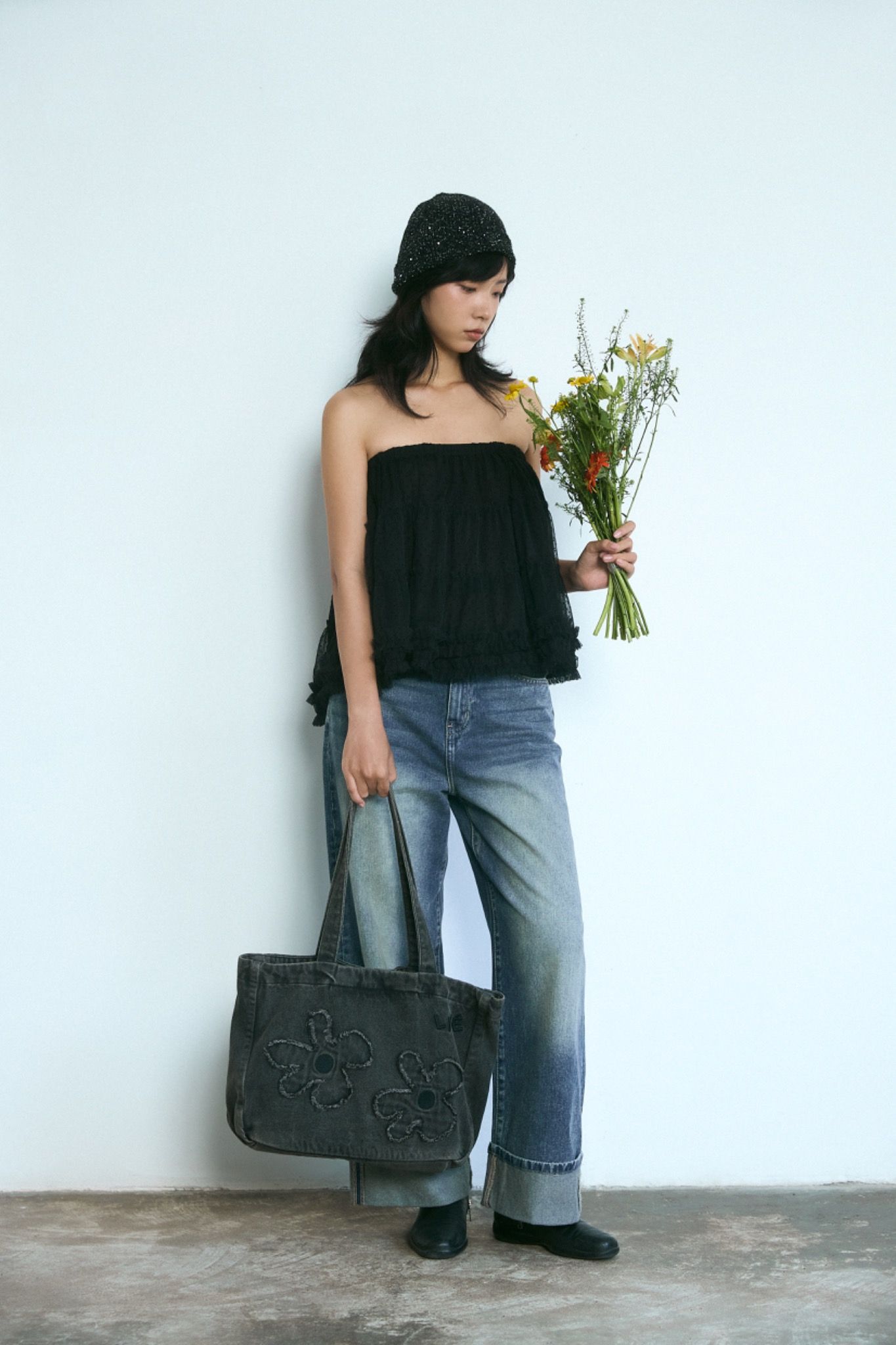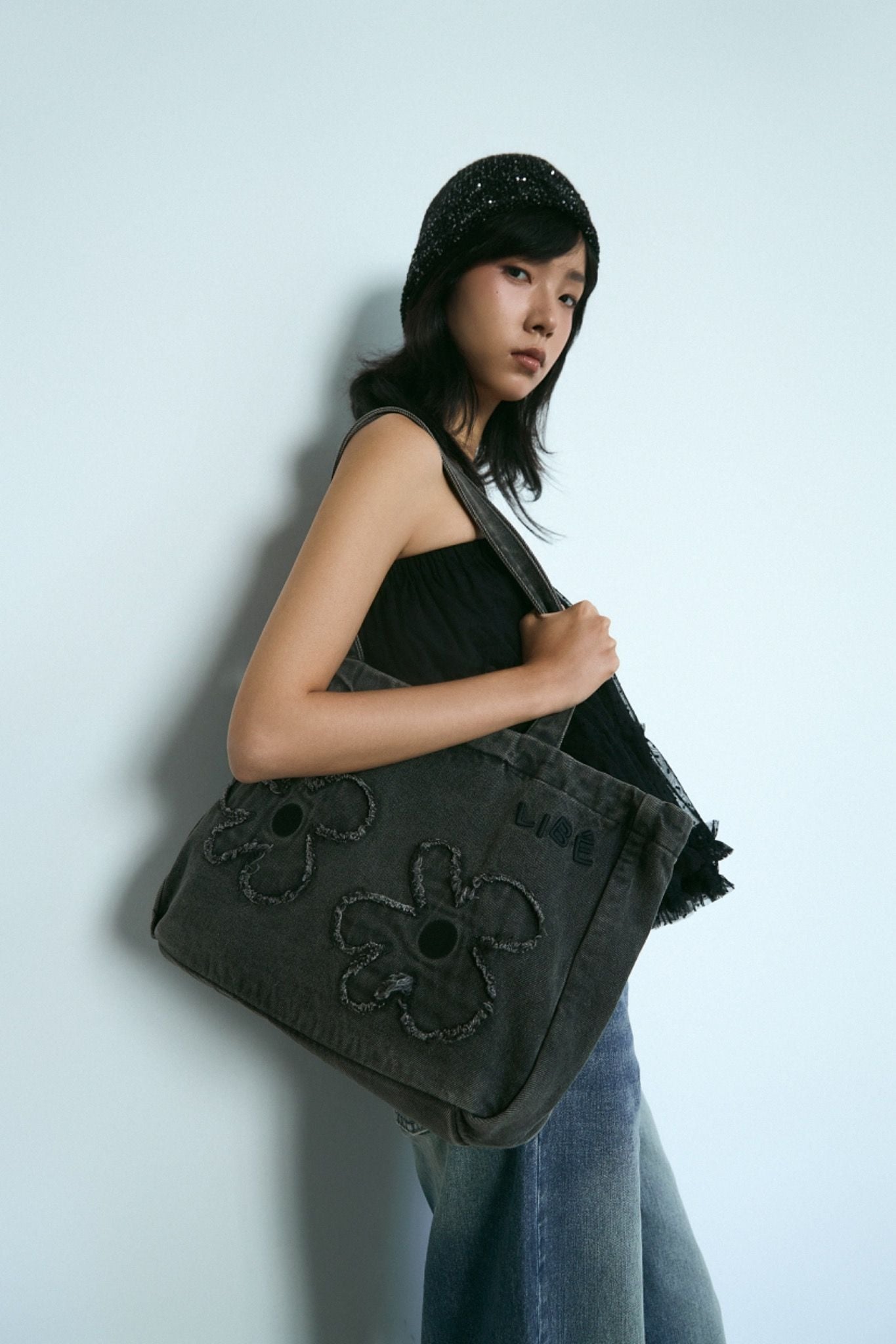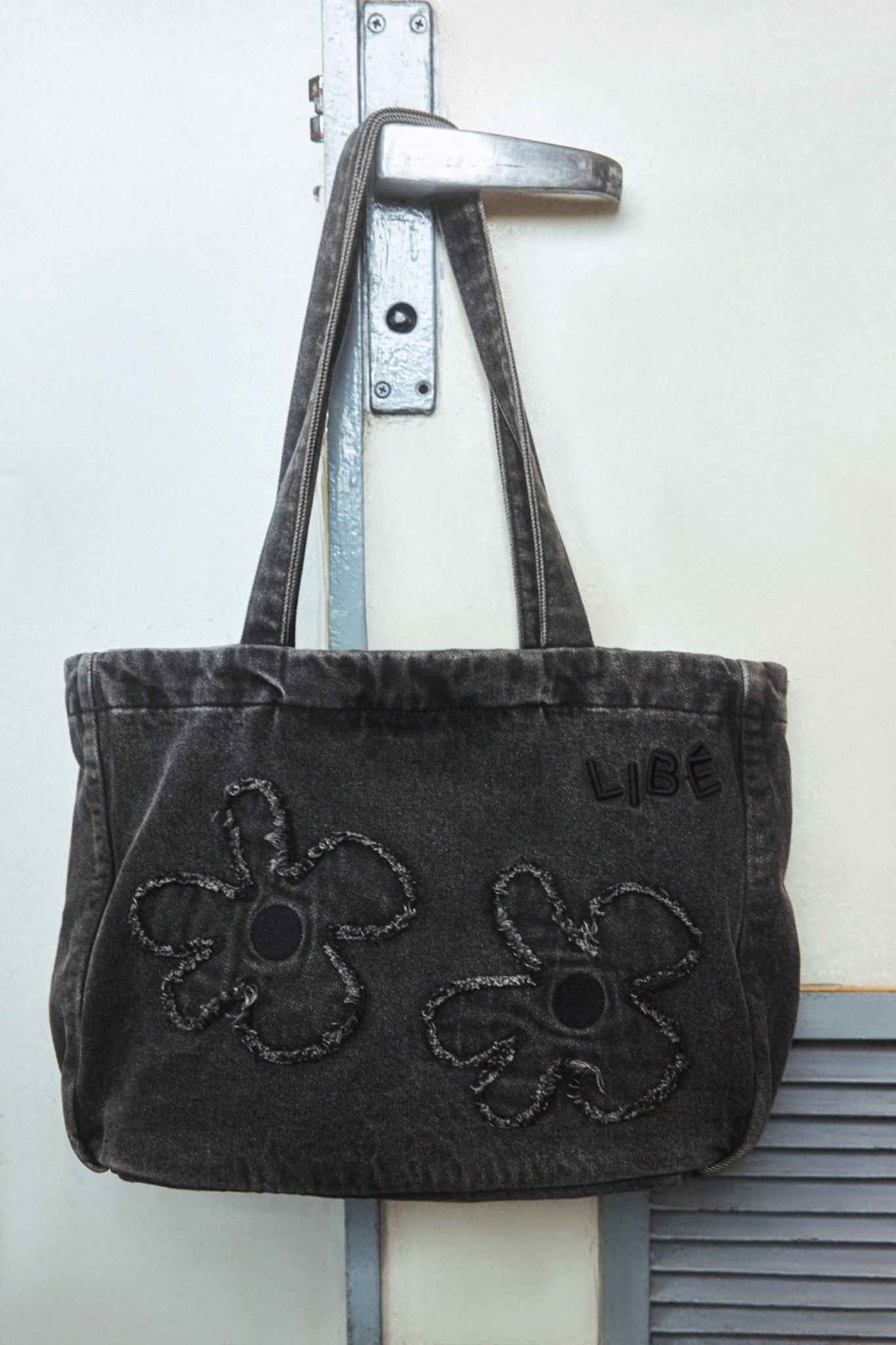 Túi tote đeo vai đa năng, vải Denim được thêu họa tiết hoa viền rách và chữ LIBÉ trên thân trước, bên trong có một ngăn nhỏ. Túi đóng mở bằng nút bấm.
