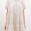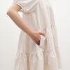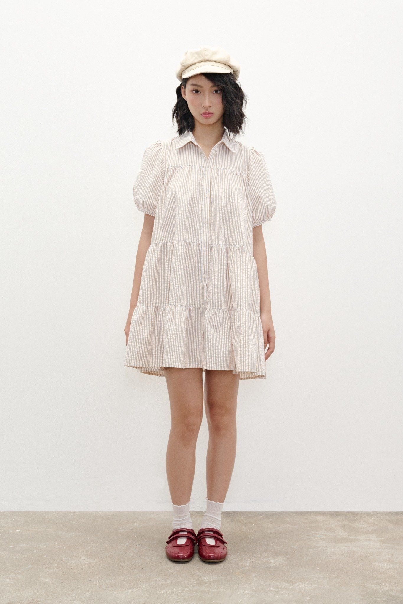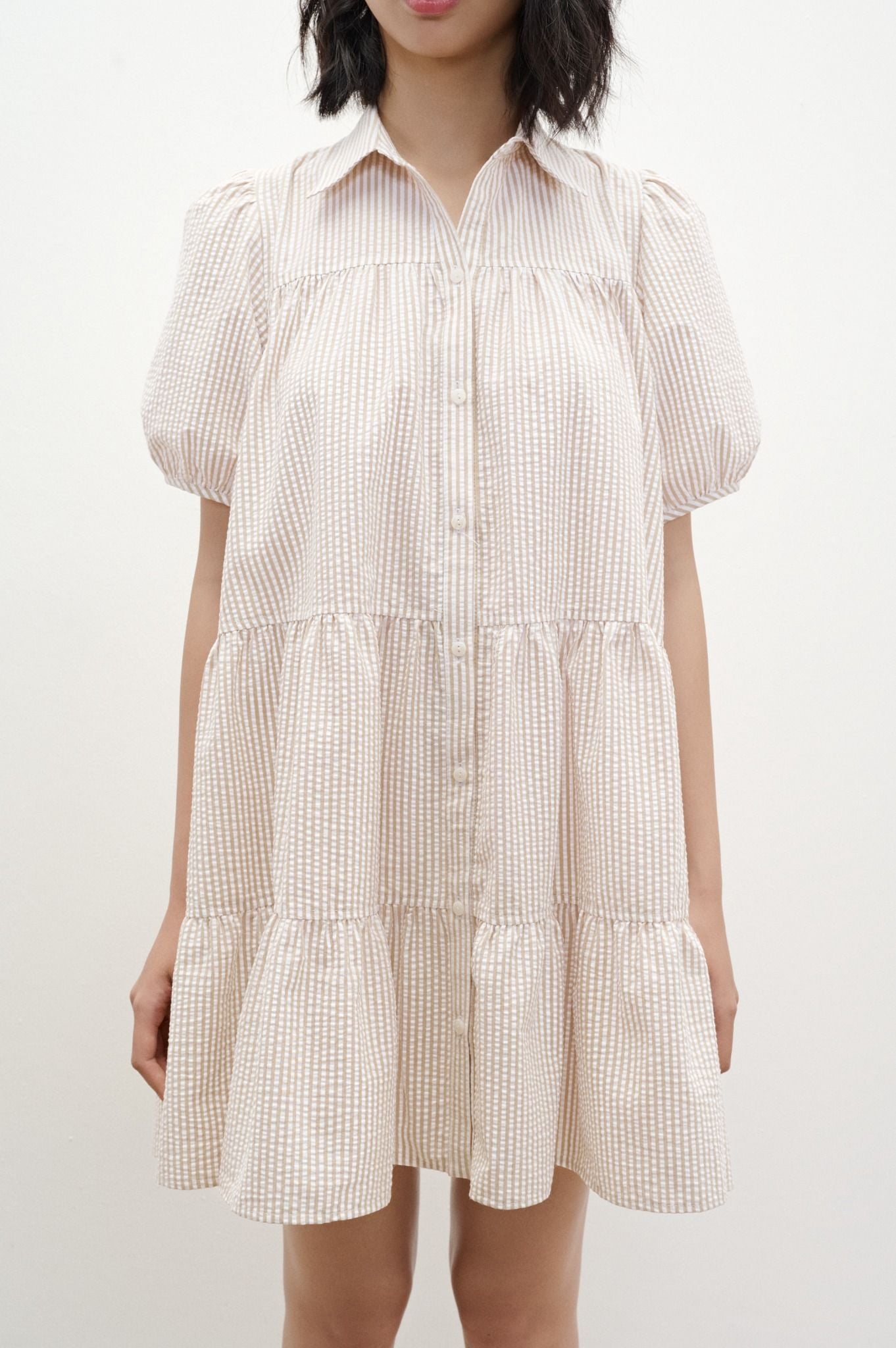 Đầm tay ngắn có độ phồng, dáng xoè ngắn trên gối, tùng xếp nhún phân tầng tạo độ phồng và cài hàng nút thân trước